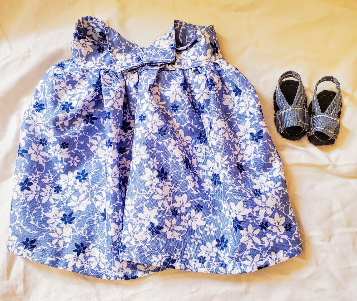 21 inch handmade one-of-a-kind plush cloth doll. Dress is removable and doll is posable. Hair is sewn in with upholstery thread. She is designed for play and a treasured keepsake. Her wrap dress attaches with velcro. Shoes are designed with crotchet thread and felt.