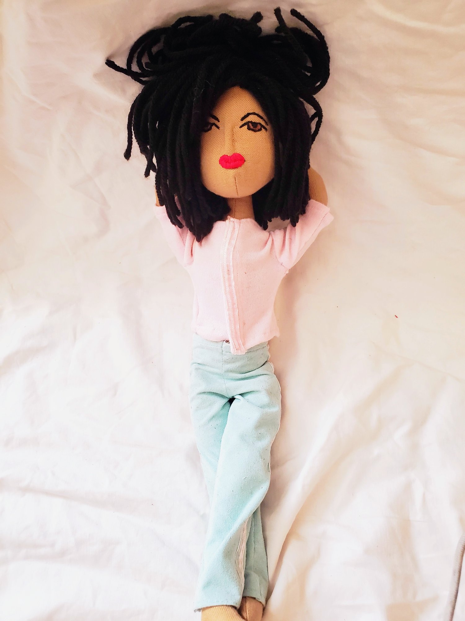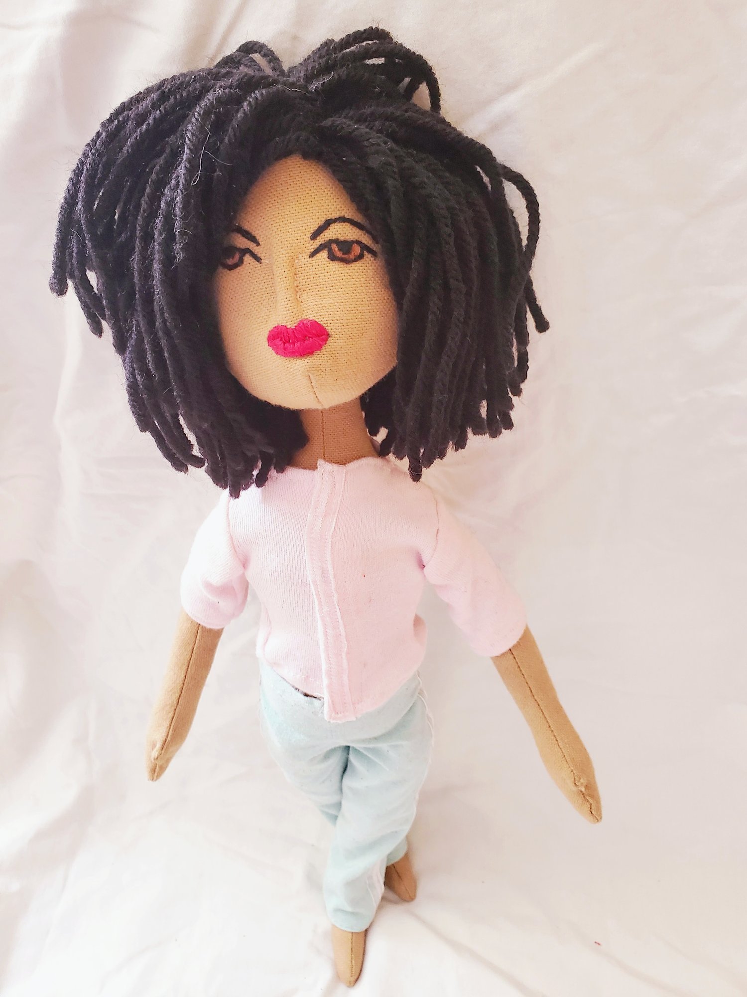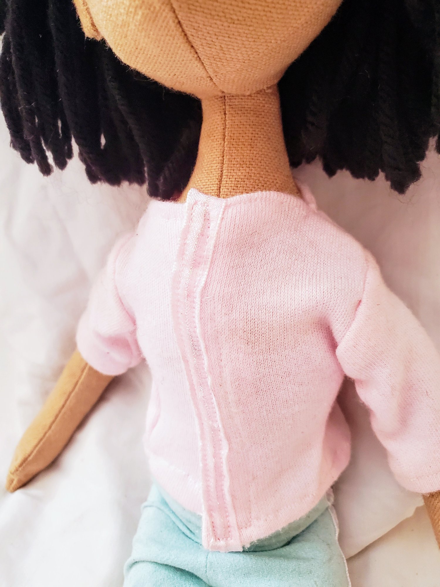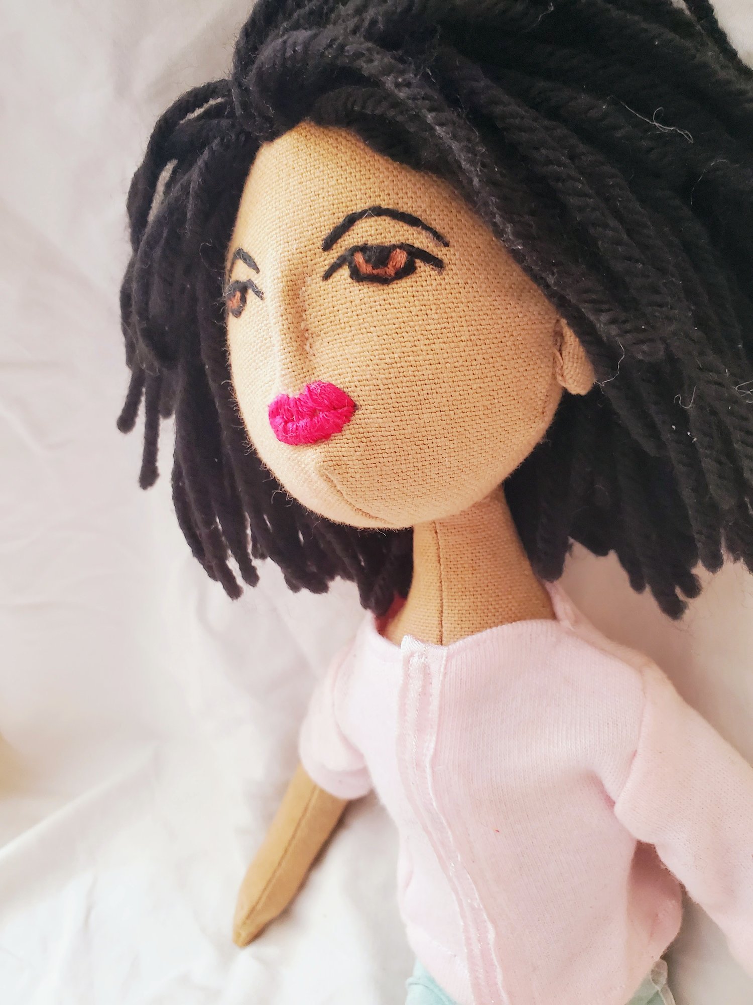 15 inch handmade one-of-a-kind cloth doll. Removable clothing and doll is jointed at the shoulders and hips for posing. Hair is sewn in with upholstery thread. She is designed for play and collection; a lovely keepsake.