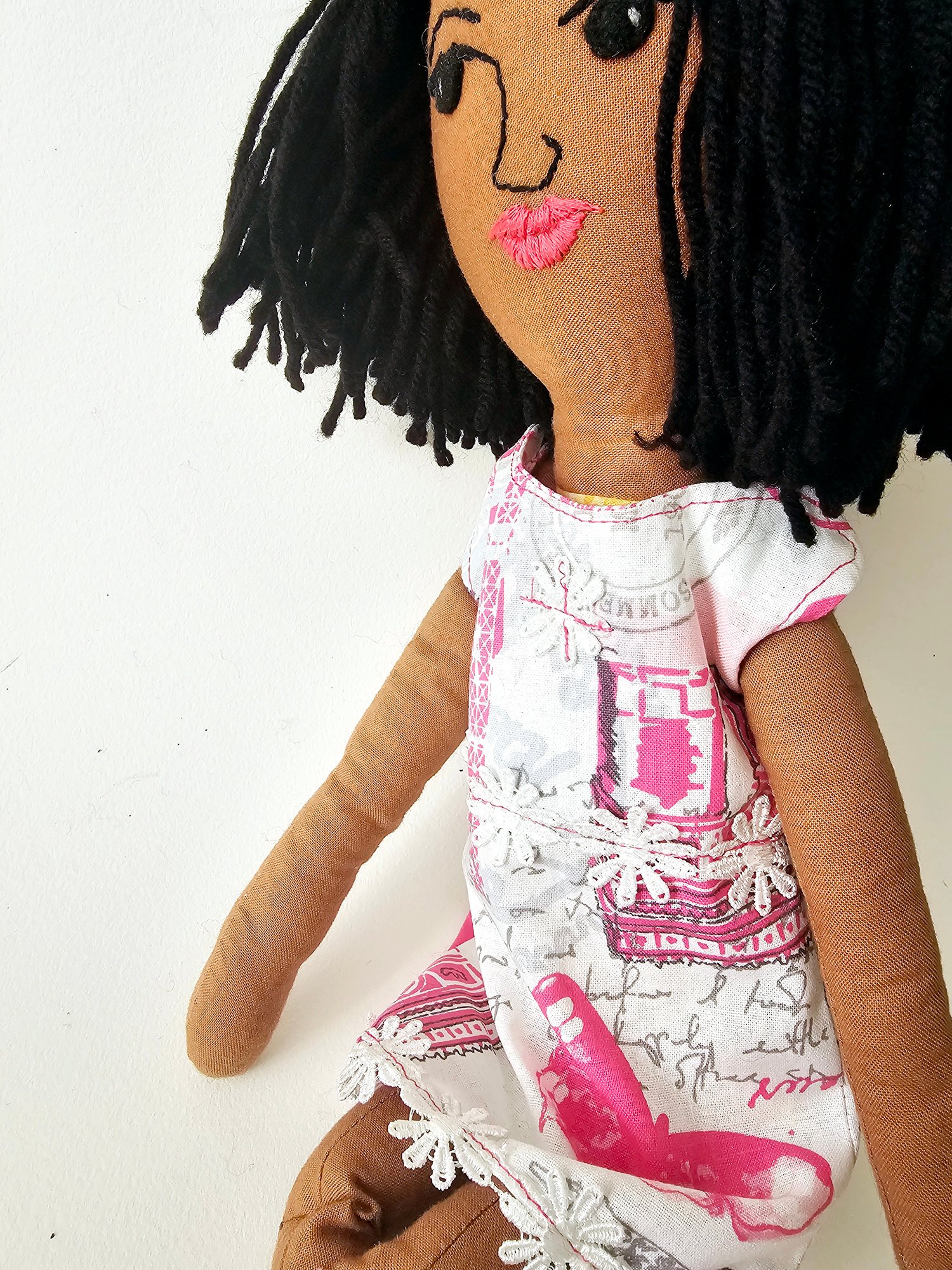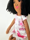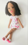 21 inch handmade one-of-a-kind plush cloth doll. Dress is removable and doll is posable. Hair is sewn in with upholstery thread. She is designed for play and a treasured keepsake. Her wrap dress attaches with velcro. Shoes are designed with crotchet thread and felt.