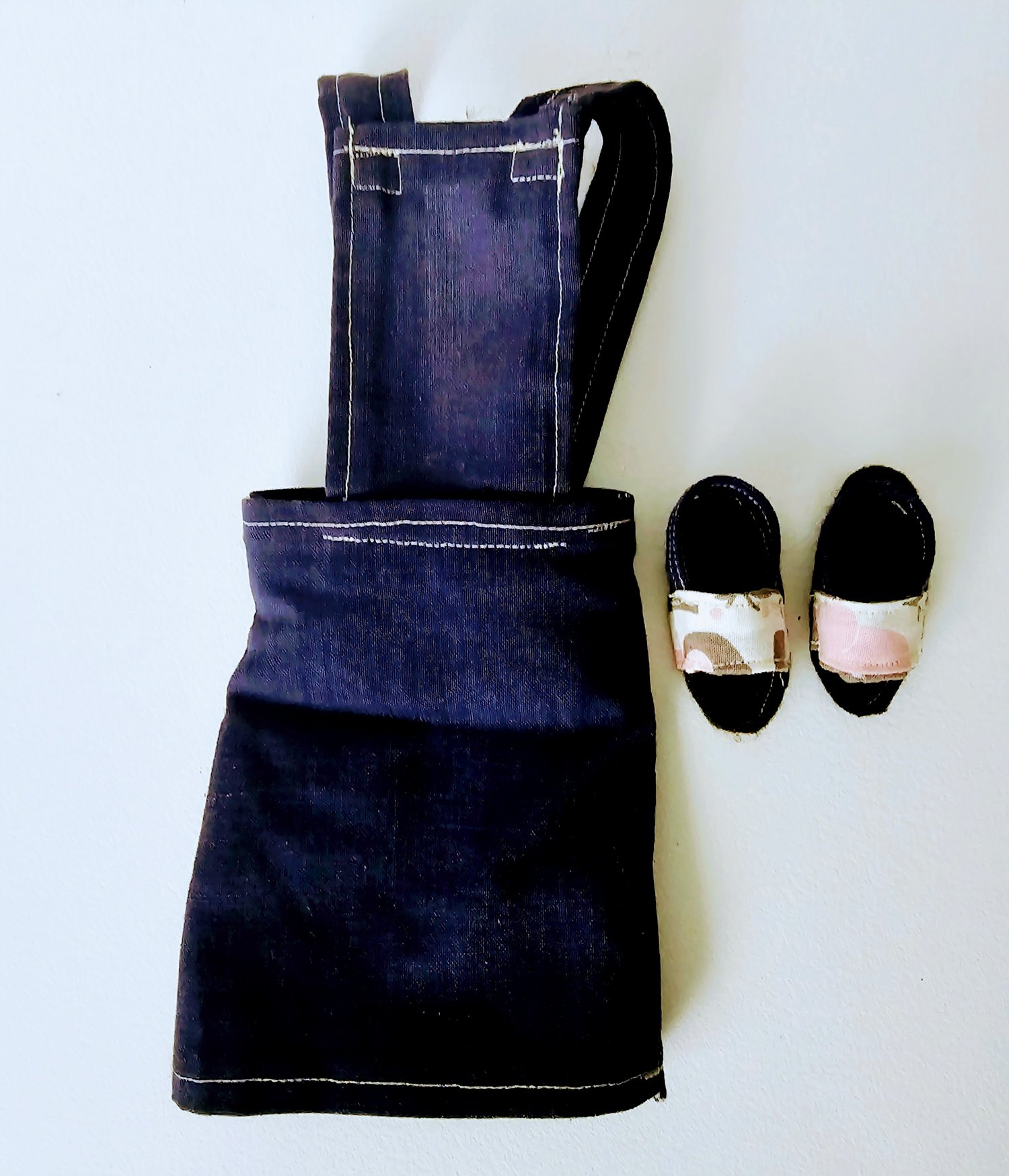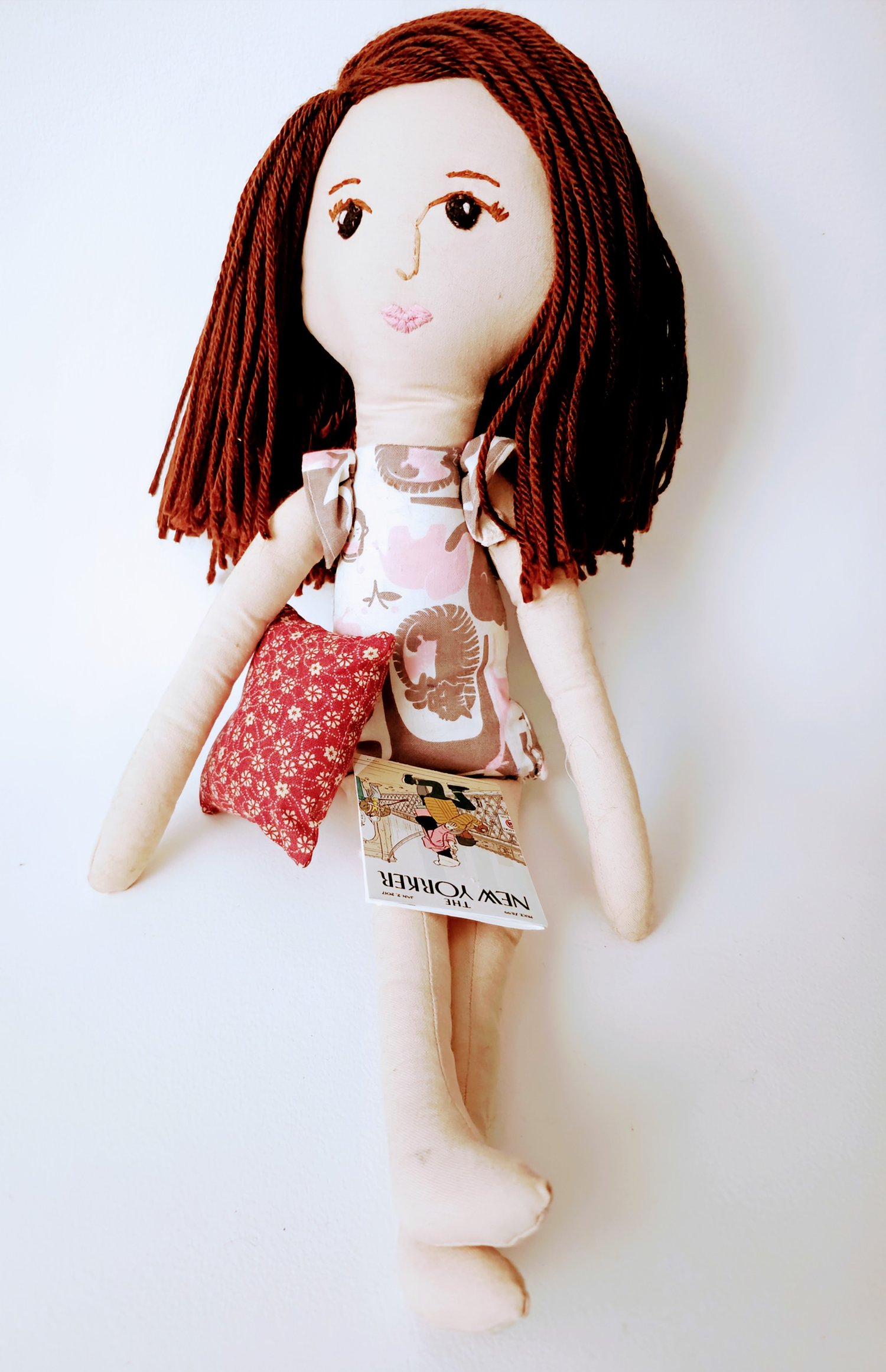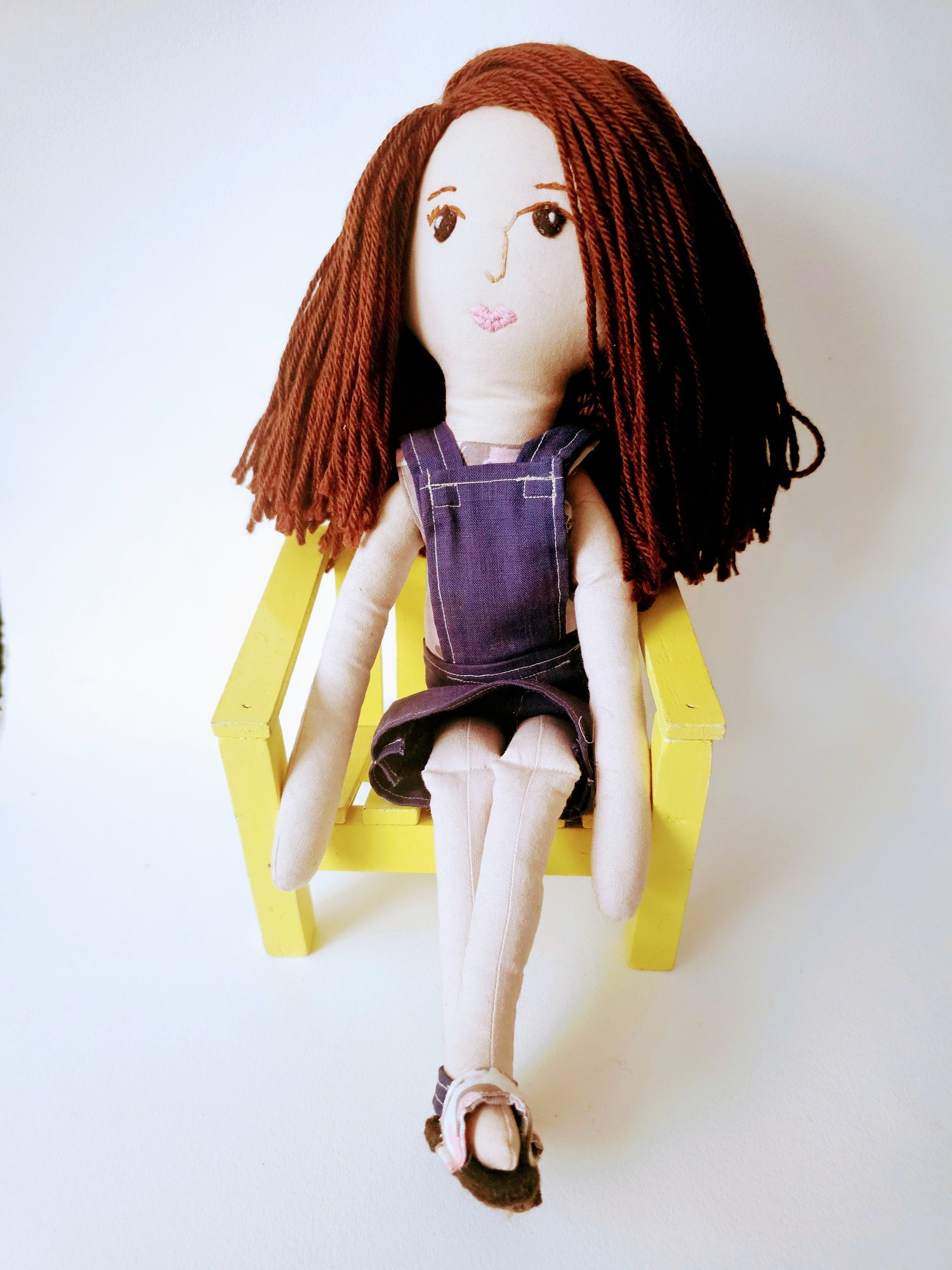 21 inch handmade one-of-a-kind plush cloth doll. Dress is removable and doll is posable. Hair is sewn in with upholstery thread. She is designed for play and a treasured keepsake. Her dress slips on and off. Shoes are designed with cotton and felt.